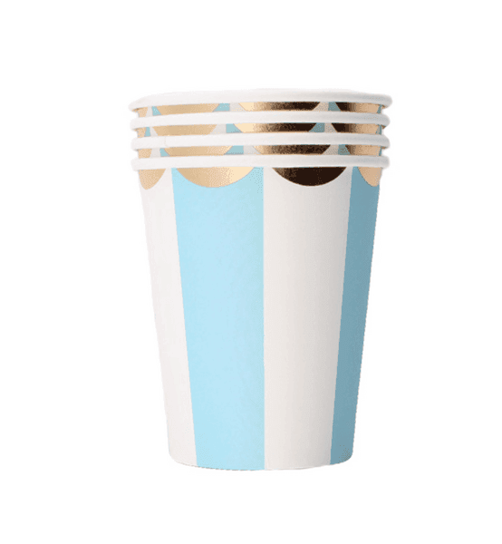 Serve your beverages in style with our Blue Candy Striped Paper Cups. Featuring classic blue and white stripes with an elegant gold rim, these cups bring a fun yet sophisticated touch to birthdays, baby showers, and themed celebrations. Perfect for both hot and cold drinks, they combine style and practicality for any event.