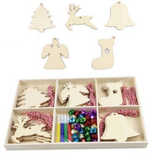 The set includes ornaments, bells, strings and pens – you can easily add more embelishments or glitter to your ornaments.