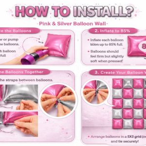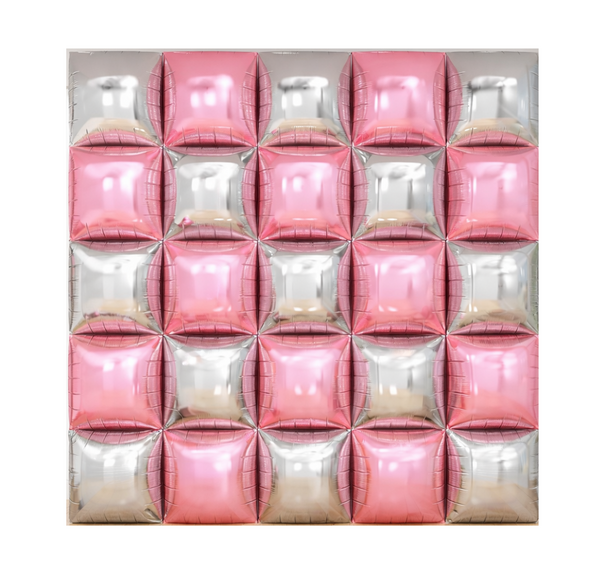 Create a bold, modern statement with this Foil Balloon Wall Backdrop – Silver and Light Pink. Featuring 25 square foil balloons arranged to form a striking 3D wall effect, this backdrop adds instant shine and dimension to birthdays, weddings, corporate events, and glamorous celebrations.