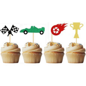 Quantity: 12 toppers (3 x flags, 3 x flaming wheels, 3 x race cars, 3 x trophies)