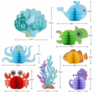 Bring the magic of the ocean to your table with this adorable Honeycomb Table Decor set! Featuring colourful sea creatures like whales, turtles, crabs, and more, these decorations are perfect for under-the-sea parties, birthdays, or baby showers. Made from lightweight honeycomb paper and vibrant card, each piece pops open to create a 3D centrepiece that kids and adults will love.