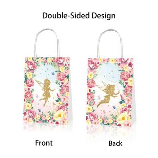 Bring enchantment to your celebration with our Fairy Theme Party Favor Bags with Handles. Featuring whimsical fairy silhouettes, soft florals, and magical accents, these bags are perfect for fairy garden, woodland, or enchanted forest-themed parties. Each bag adds a sprinkle of charm to your party setup and is ideal for holding sweets, small gifts, or toys.
