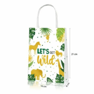 Turn your party into a wild adventure with our Let's Get Wild Safari Theme Favor Bags! Featuring bold jungle leaves and golden animal silhouettes, these stylish and sturdy bags are perfect for safari-themed birthdays, baby showers, or “wild one” celebrations.
