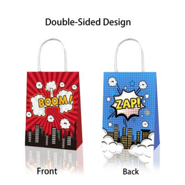 Add action-packed flair to your celebration with our Superhero Theme Party Favor Bags with Handles! Featuring dynamic comic-style graphics like “ZAP!”, “BOOM!”, and “POW!”, these bags are perfect for superhero-themed birthdays and events.