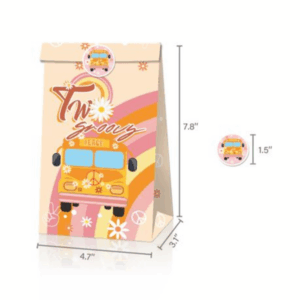 Bring retro vibes to your child’s celebration with these Two Groovy Hippy Theme Party Favor Bags! Featuring vibrant colors, peace signs, rainbows, and flower power designs, these party bags add the perfect touch to any groovy-themed birthday bash. Each bag comes with a matching sticker to seal in the fun, making them ideal for sweets, toys, or thank-you treats.