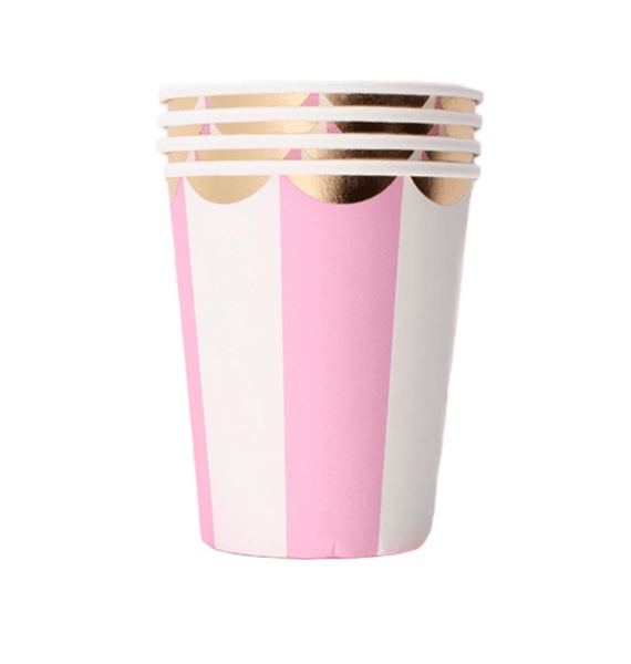 Add a sweet touch to your drinks table with our Pink Candy Striped Paper Cups. Designed with soft pink and white stripes topped with a shimmering gold rim, these cups are perfect for serving both hot and cold beverages at birthdays, baby showers, and themed celebrations. Stylish, practical, and disposable for easy cleanup.