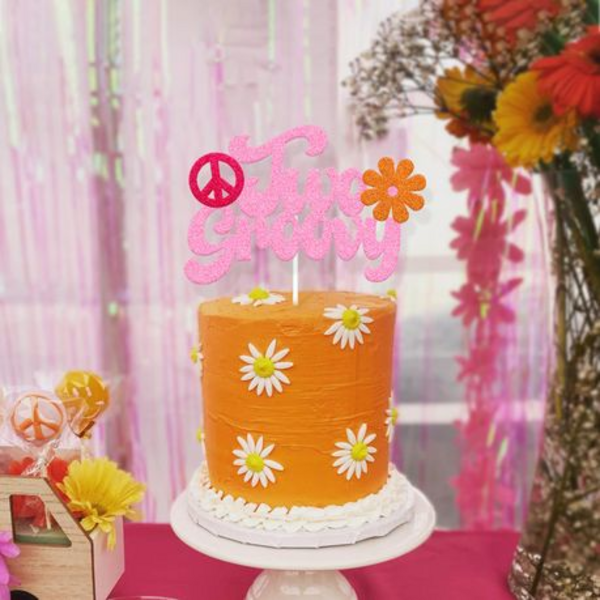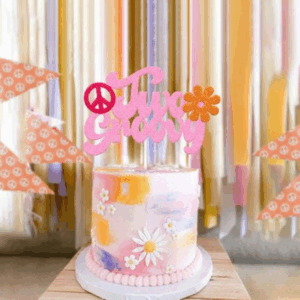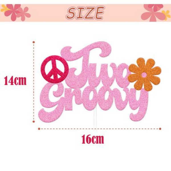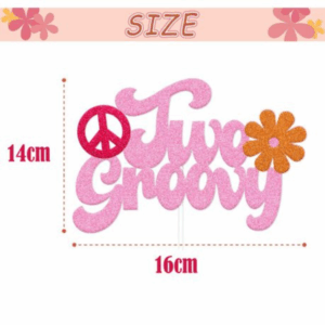 Add retro flair to your little one’s celebration with this vibrant Two Groovy Cake Topper. Perfect for plain or decorated cakes, this pink glitter topper with peace sign and flower details brings a fun 70s vibe to any second birthday party.