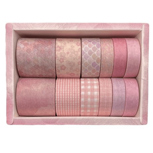 Elevate your creativity with our charming Washi Tape Box Set of 12 (Pink Patterns). This beautifully curated set features soft pink hues and delicate designs—from florals and gingham to pastels and scales—perfect for adding a stylish touch to any project.